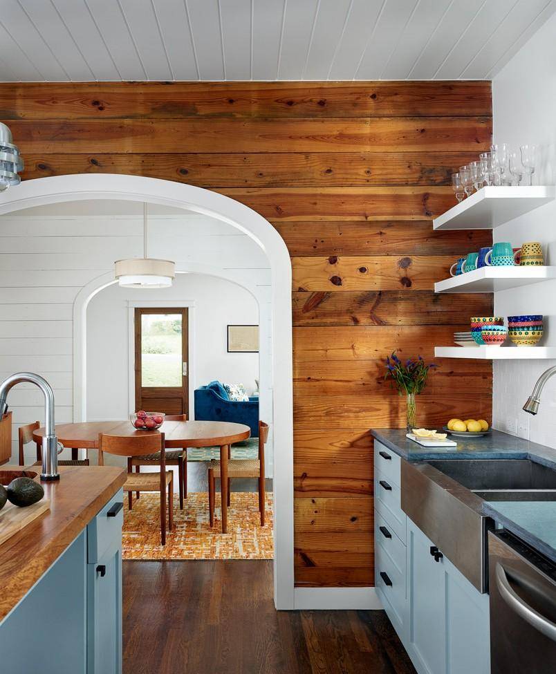 Если вы остановились на стиле прованс и открытых полках вместо шкафов, то столешница из массива дерева идеально впишется в дизайн.