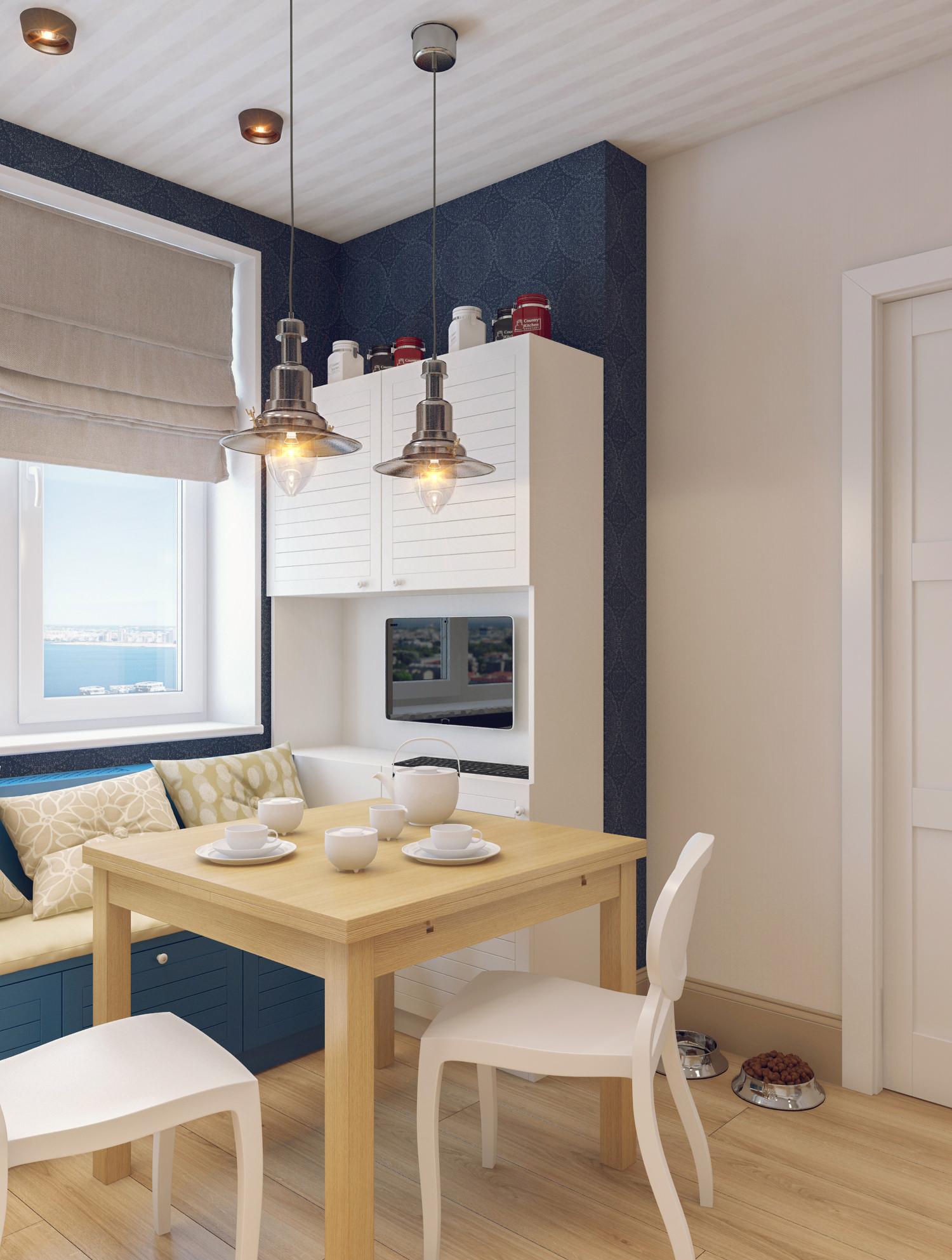 В центре кухни должен располагаться миниатюрный круглый стол, как видно на фото. А окно предполагает воздушные шторы в пол.