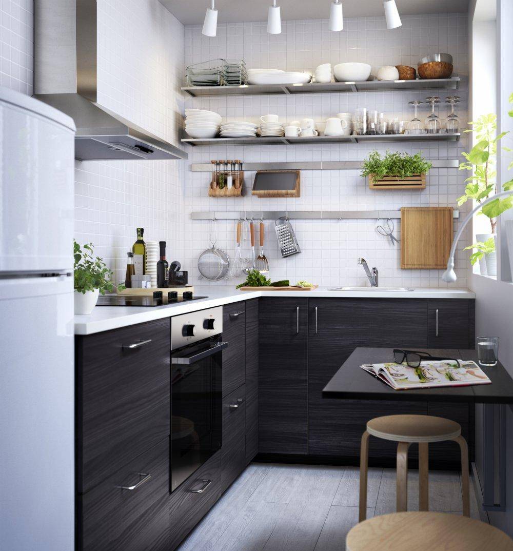 Несмотря на то что темный цвет довольно редко применяется при оформлении интерьера малогабаритной кухни, смотрится он поистине шикарно