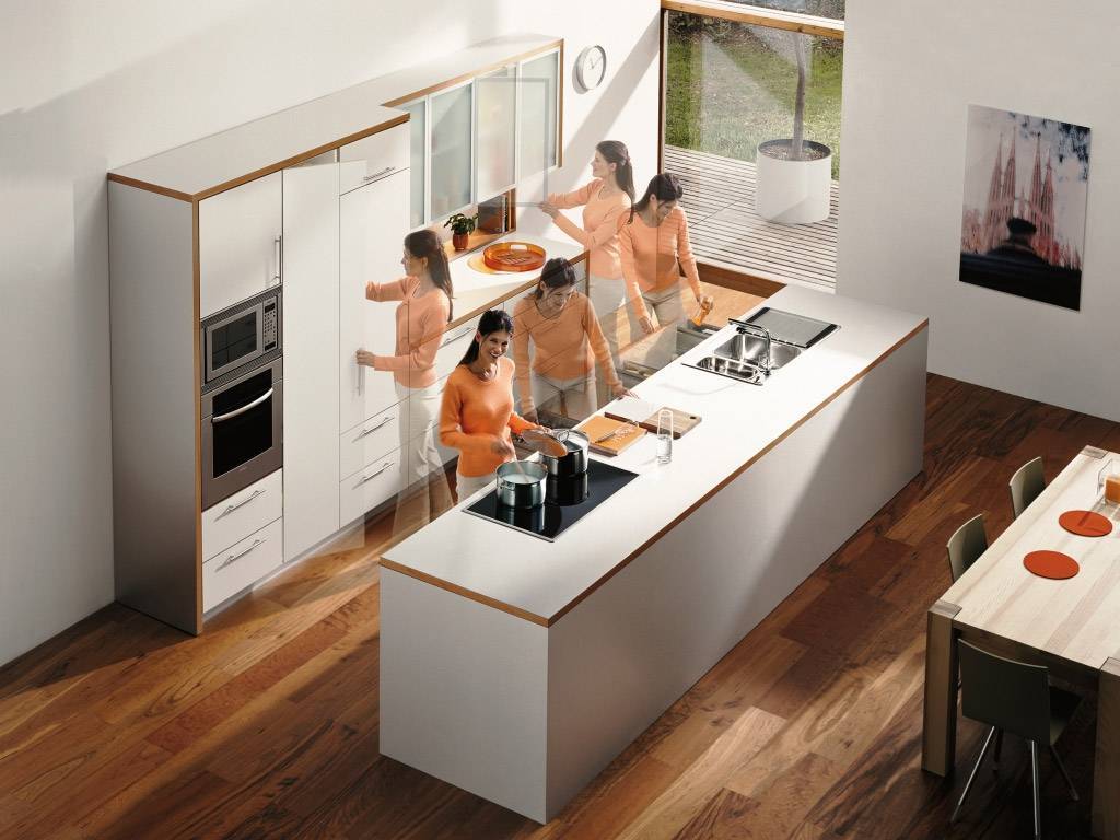 Функциональность помещения, комфорт напрямую зависят от расстановки мебели. С учетом специфики для маленьких пространств разработана теория треугольной геометрии, то есть особого расположения рабочей зоны.