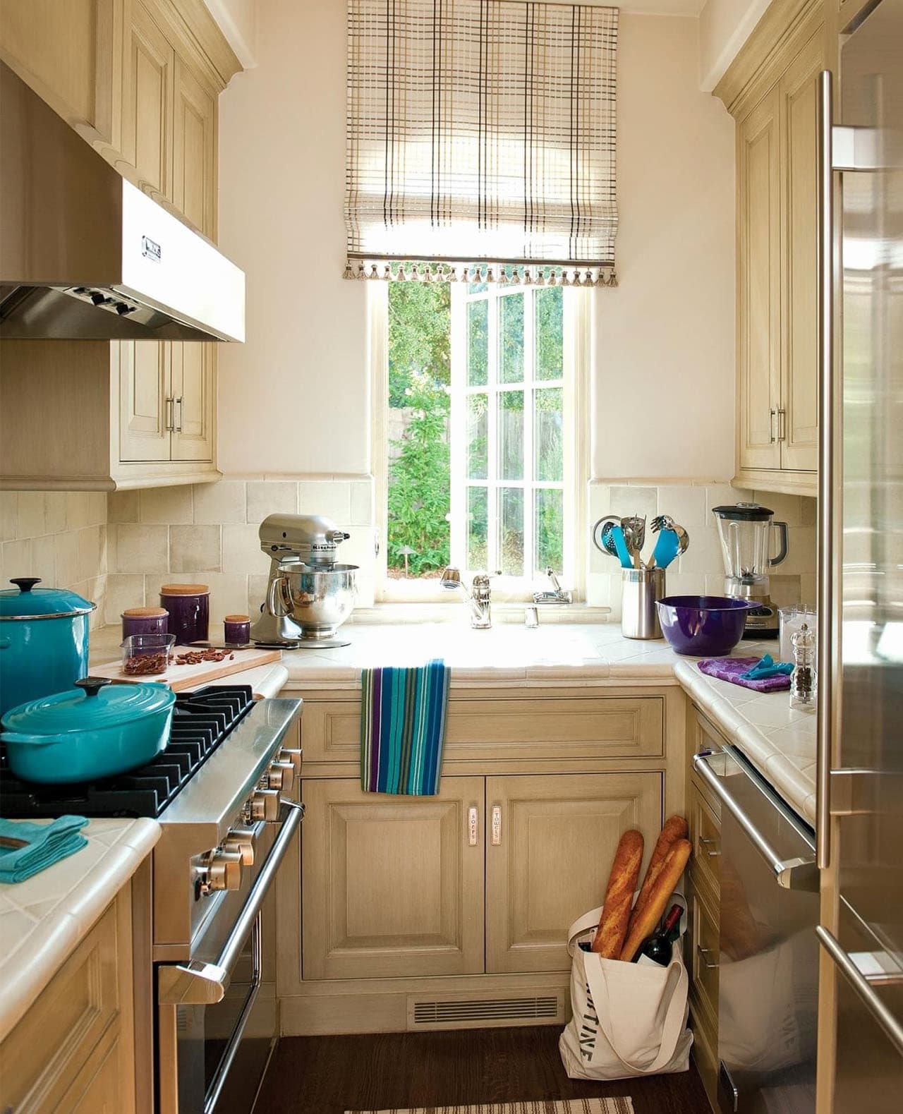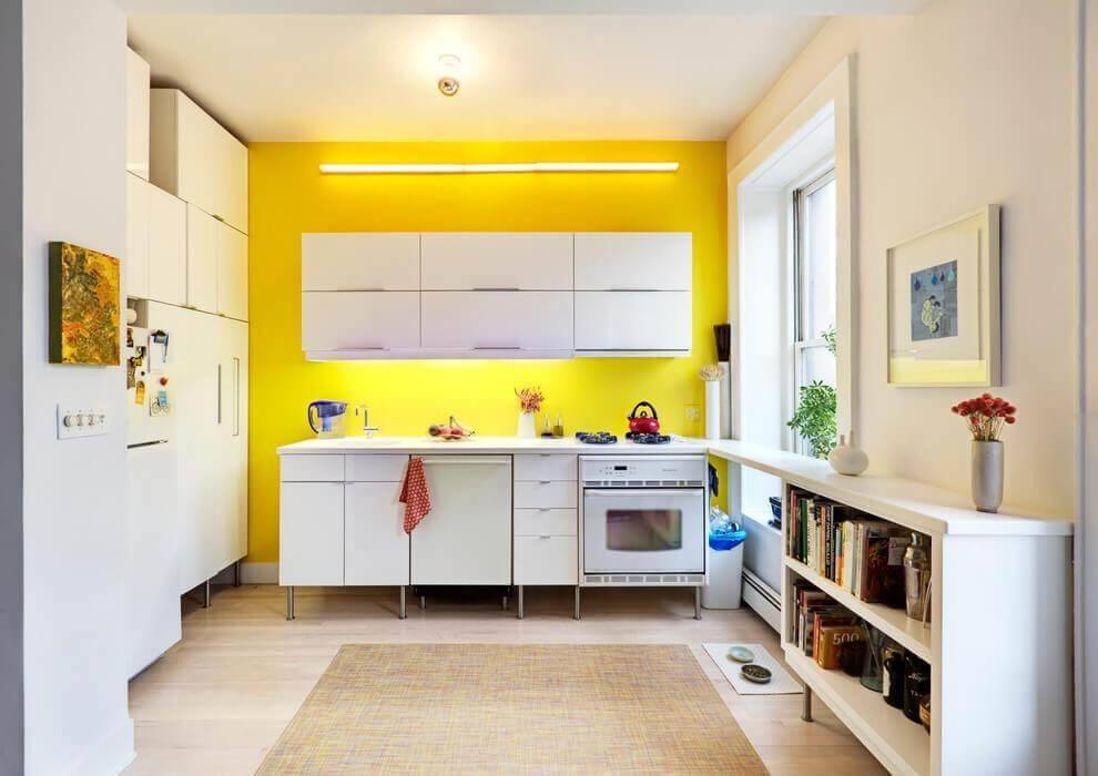 Современные маленькие кухни позволяют многое сделать с цветом. Вам не нужно придерживаться бледных цветов, кремовых и белых. Если вы используете один и тот же цвет последовательно, более глубокий оттенок может дать “вау-фактор”. Просто избегайте очень темных оттенков. Вы также можете покрасить кухонную дверь, если хотите обновить свое кулинарное пространство.