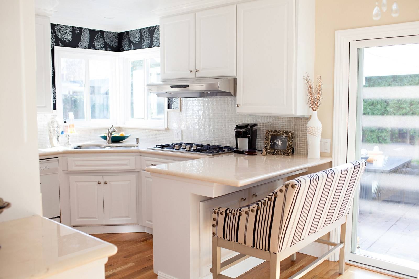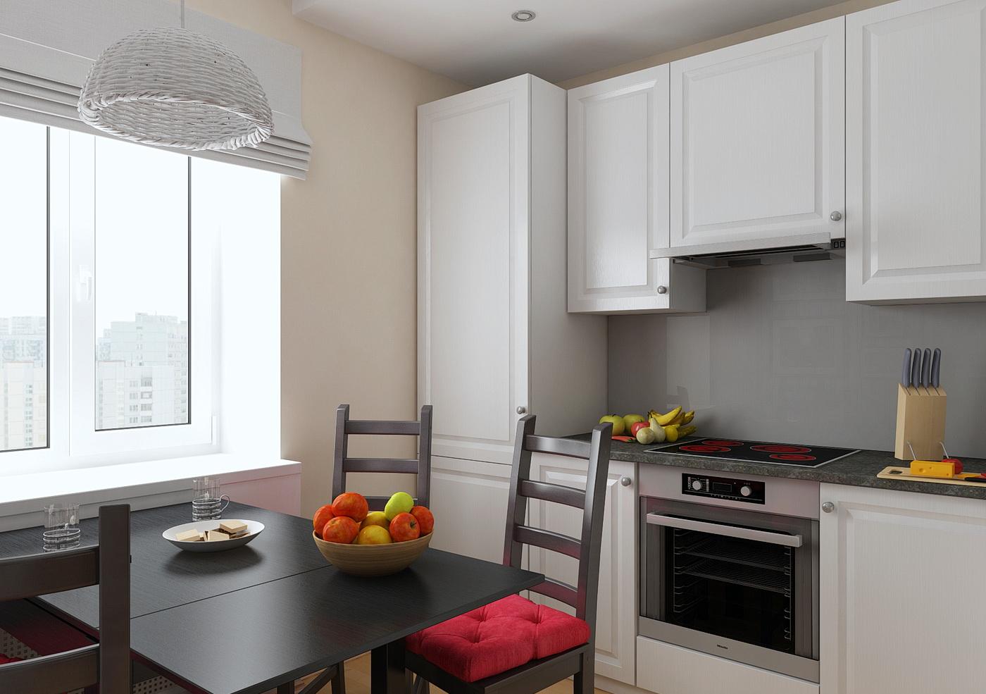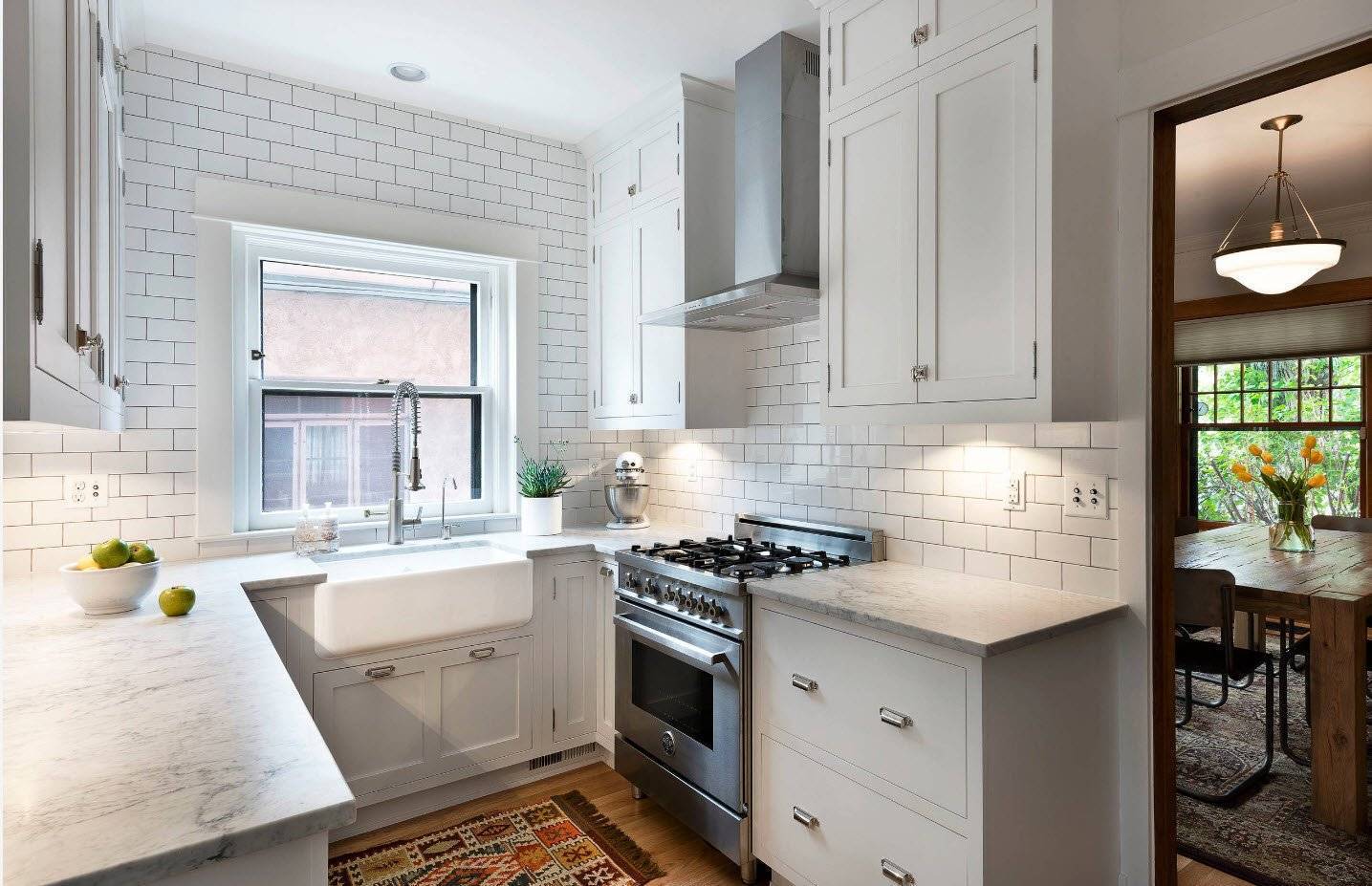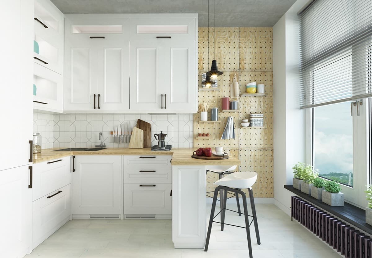 Выбеленные тона зрительно увеличат небольшое пространство. Для того, чтобы интерьер маленькой кухни не выглядел монотонно, его разбавляют темными цветами или аккуратными яркими акцентами.