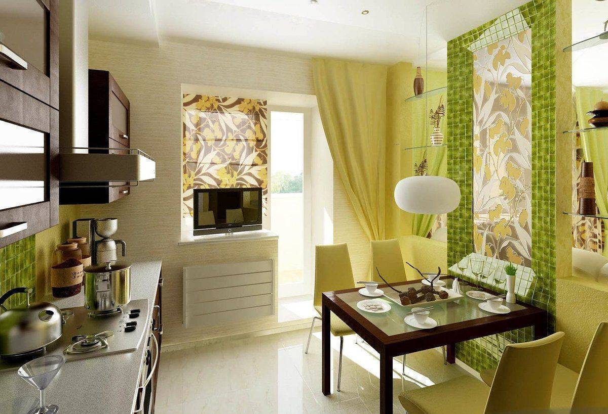 - Вариант кухни с выходом на балкон. Зонирование обеденного пространства.