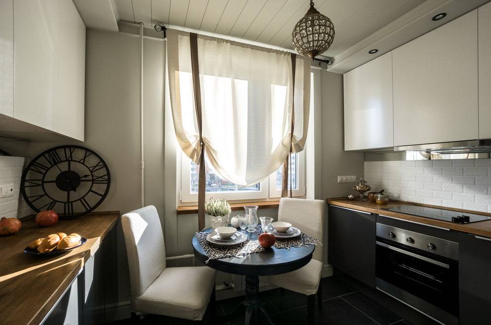Окна оформляем привлекательными и обязательно легкими шторками. Столовая зона в слишком узкое пространство кухни, к сожалению не вписывается.