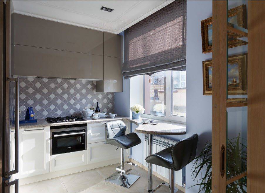 Сегодня эти модели отличаются компактностью и эргономичностью. Они весьма функциональны, предусматривают наличие навесных шкафчиков и разнообразных полок. Если комната имеет эркерный выступ, именно его задействуют под обеденную зону, обустраивая столиком и компактными стульями.