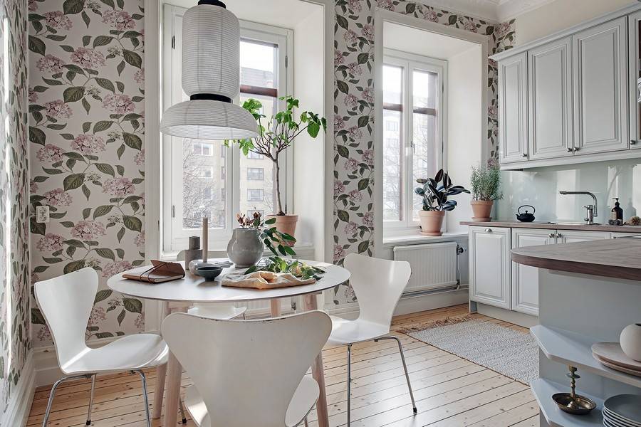 На кухне хорошо смотрятся обои с матовой текстурой. Выигрышны будут пастельные тона — они визуально расширяют небольшое помещение. Наиболее удачным выбором для кухни будут бежевые, лазурные, светло-желтые и кремовые оттенки обоев.