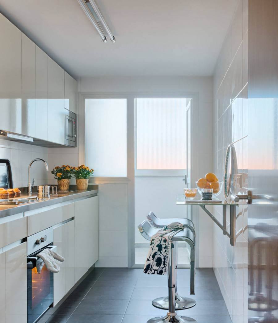 - Угловая кухня с навесными шкафчиками, использование металлической фактуры мебели и складной конструкции стола.