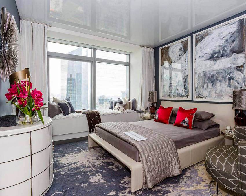 Жених и невеста могут позволить себе оформить в спальне светлый потолок с разнообразными осветительными приборами для создания романтической атмосферы, но нет гарантии, что через короткое время им не придется менять потолок на более светлый, сдержанный один. Яркая облицовка потолка имеет свойство сжимать пространство.