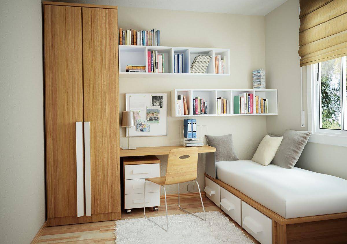 - Полки, стеллажи, встроенные или подвесные шкафчики. Продуманная система хранения избавит Вас от лишнего хлама и валяющихся предметов, которые превращают небольшую спальню в чулан.