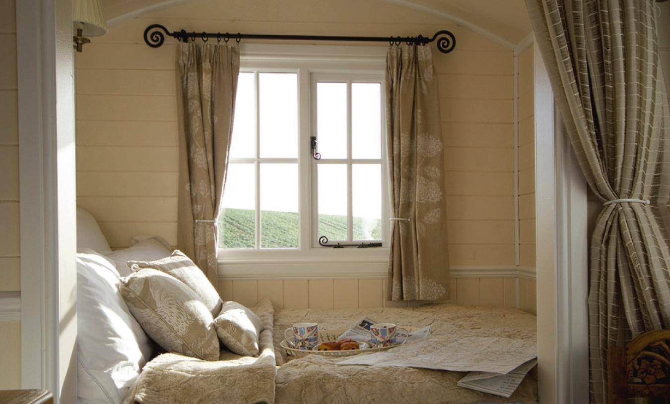 - Короткие шторы будут особенно полезны, если некоторая часть мебели располагается возле окна. Шторы длиной чуть ниже подоконника выглядит практично и компактно.