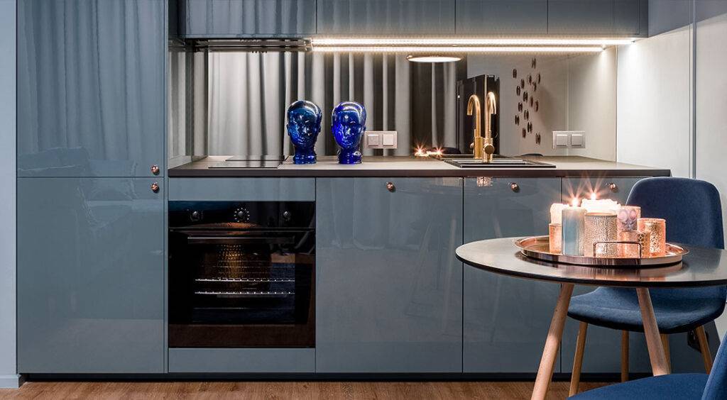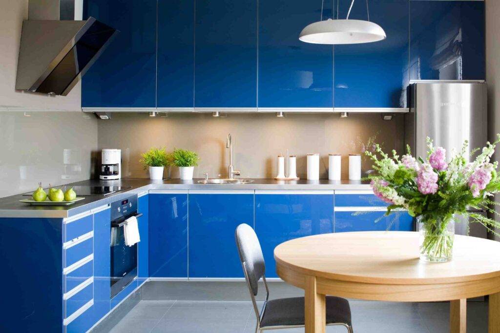 В синем цвете много разных оттенков — от ультра-яркого синего, через морские оттенки, до темного, насыщенного темно-синего. В зависимости от ваших предпочтений и условий помещения вы можете добиться различных эффектов. Если вы любите нежные и утонченные интерьеры, вам подойдет кухня в пастельных, голубых тонах. Если вы предпочитаете смелые решения — выбирайте более темный цвет. Однако самое главное — умеренность — не стоит преувеличивать.