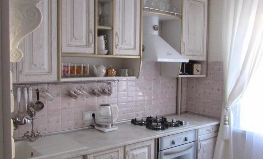 Прованс, представляет пастельная палитра в отделке стен, пола и потолка, использование цветочных узоров и установка винтажной мебели. Подобный нежный и легкий дизайн прекрасно вписывается в кухню со скромным метражом.