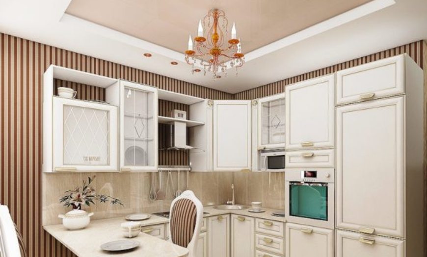 Роскошные традиционные стили с лепниной, объемным декором и массивной мебелью не подойдут. А вот современную классику вполне возможно воплотить на 5-7 кв.м. Выбирайте гарнитур с филенчатыми, рамочными фасадами, но компактный и в светлых тонах.