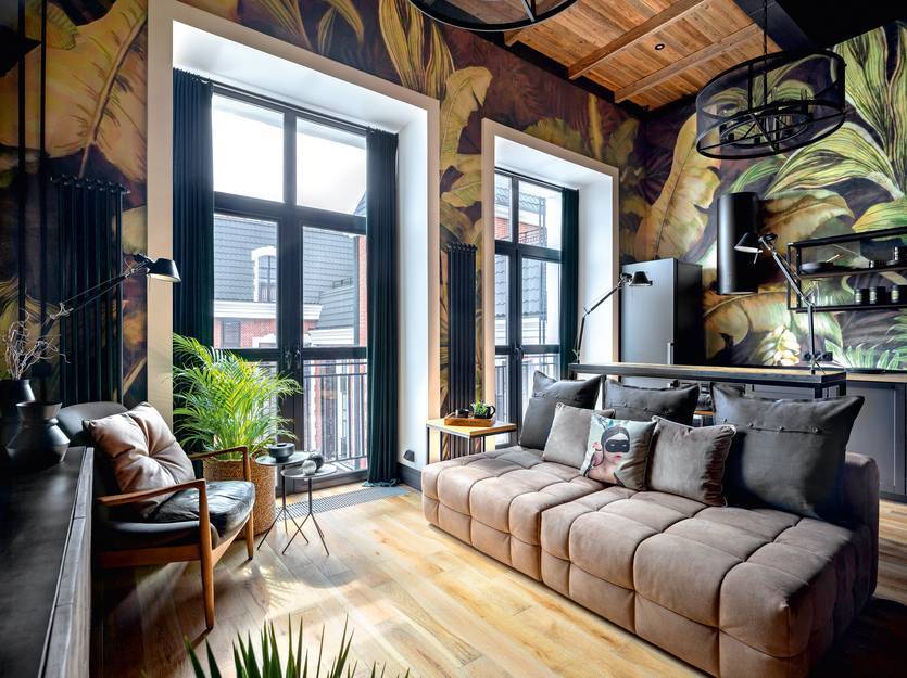 Насыщенные обои глубокого цвета также способны воссоздать богемную «фабричную» атмосферу.