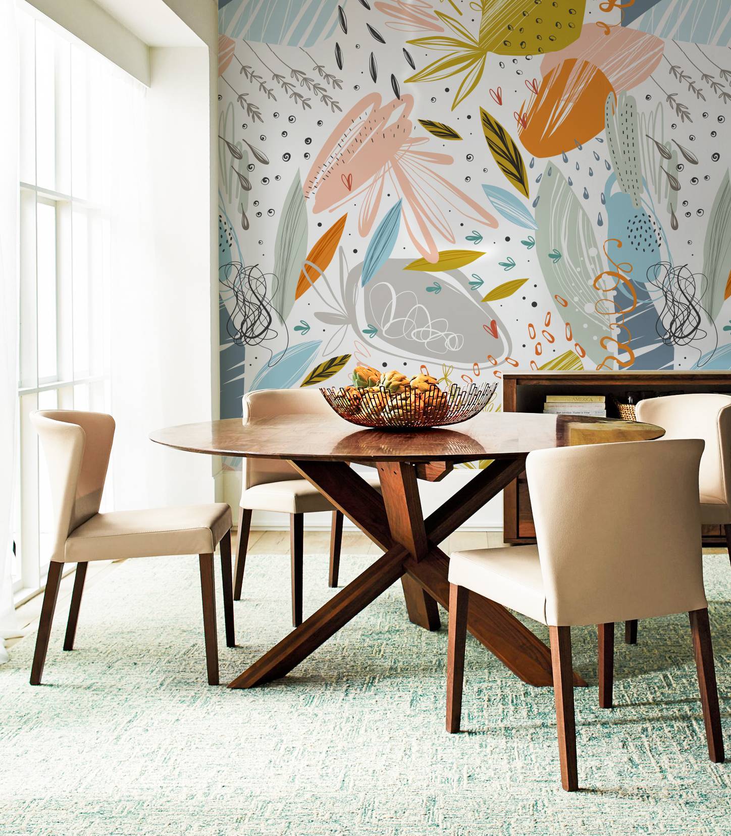 Это новинка обоев для кухни прочно закрепилась в 2023 году. Традиционные мотивы Азии, арабские узоры или сказочные орнаменты Востока – любой вариант украсит интерьер. Но с этникой стоит быть осторожнее. Чтобы не перегрузить дизайн, стоит отдавать предпочтение материалам с упрощенными принтами.