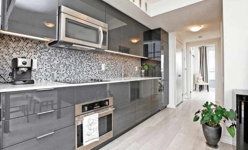 - Серый цвет придаст кухне строгий и аристократичный вид. Его легко комбинировать с другими тонами, поэтому он никогда не выглядит скучно и уныло.