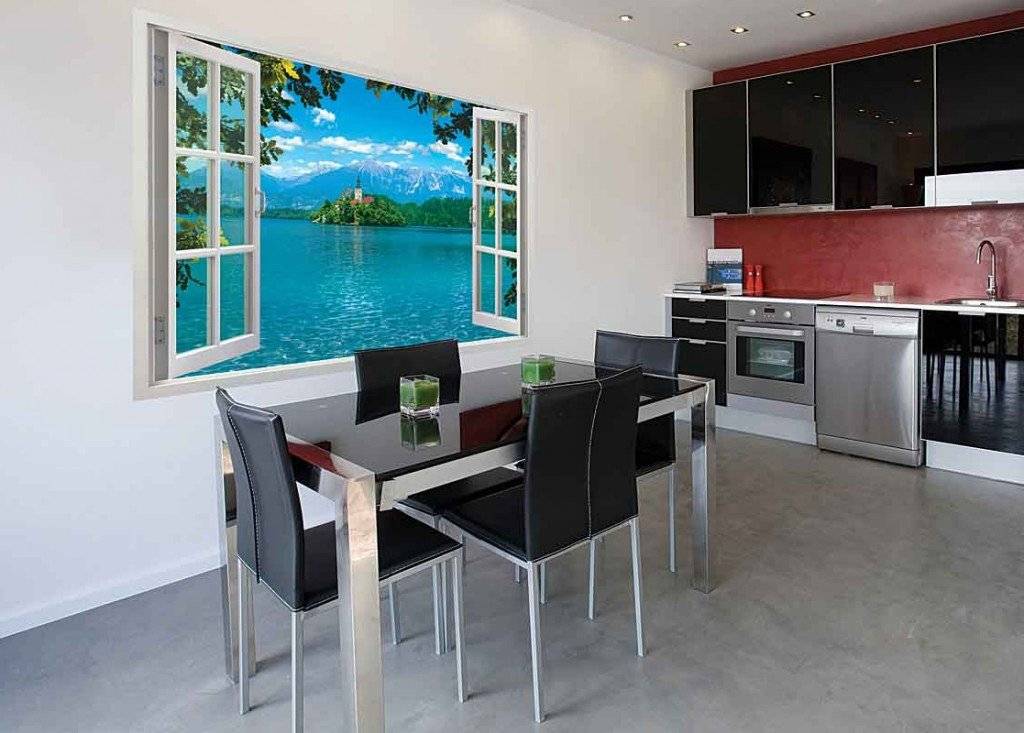 Визуально добавят кухне дополнительного пространства фотообои с фальш-окнами и фальш-дверями. Окна могут быть изображены с рамой, за которой открывается пейзаж озера, сада, леса, морского побережья. Оригинальной идеей обоев для кухни является имитация двери с выходом на балкон, с которого открывается панорама города. Такие картины являются своеобразным порталом, благодаря которому можно перенестись в другое место.