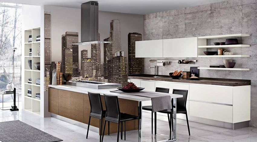 Морская и урбанистическая тематика обоев в маленькую кухню