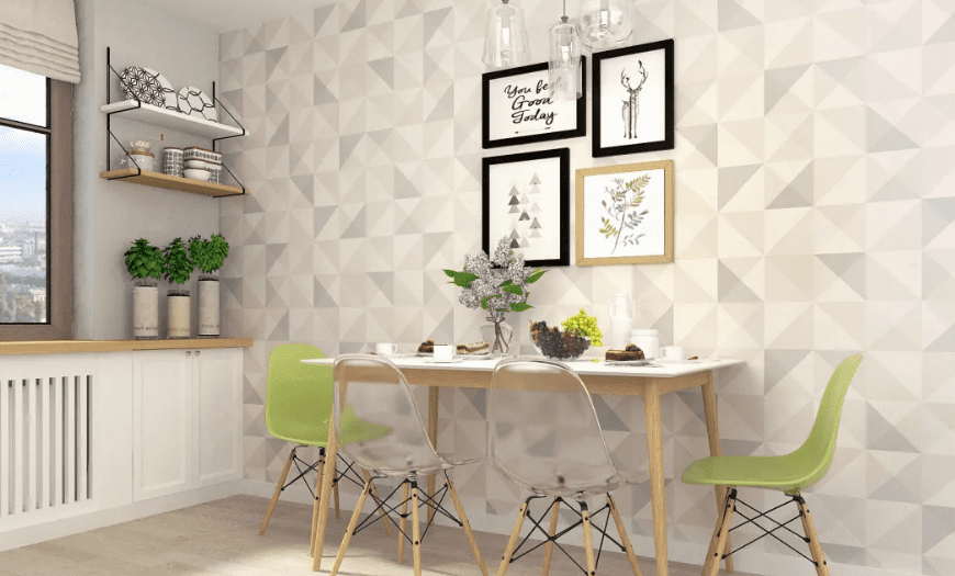 Принт с повторяющимся рисунком легко узнать по цветному омбре, перламутровому блеску и сложному узору. Чем сложнее дизайн, тем менее он подходит для кухни. Чтобы не ошибиться с выбором обоев, стоит отдавать предпочтением простым абстракциям.