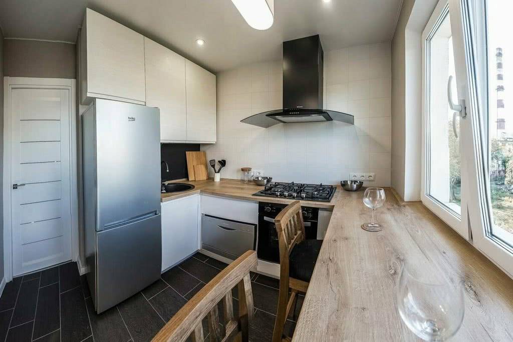 Все чаще роль барной стойки исполняет подоконник, который облицовывают прочным материалом и при необходимости делают более широким. Таким образом дизайн маленькой кухни 2020 становится более привлекательным и удобным.