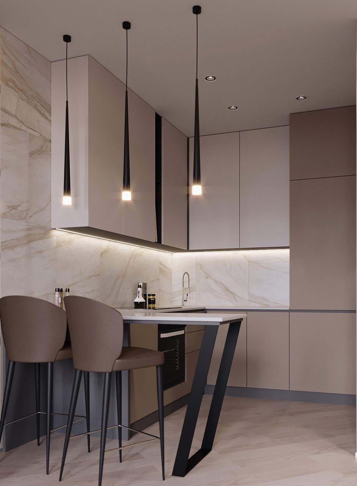 Очень важно осветить функциональные зоны, используйте холодные оттенки, чтобы обеспечить хорошую видимость и упростить приготовление еды. Также продумайте декоративное освещение, чтобы акцентировать внимание на определенных участках и зрительно увеличить комнату