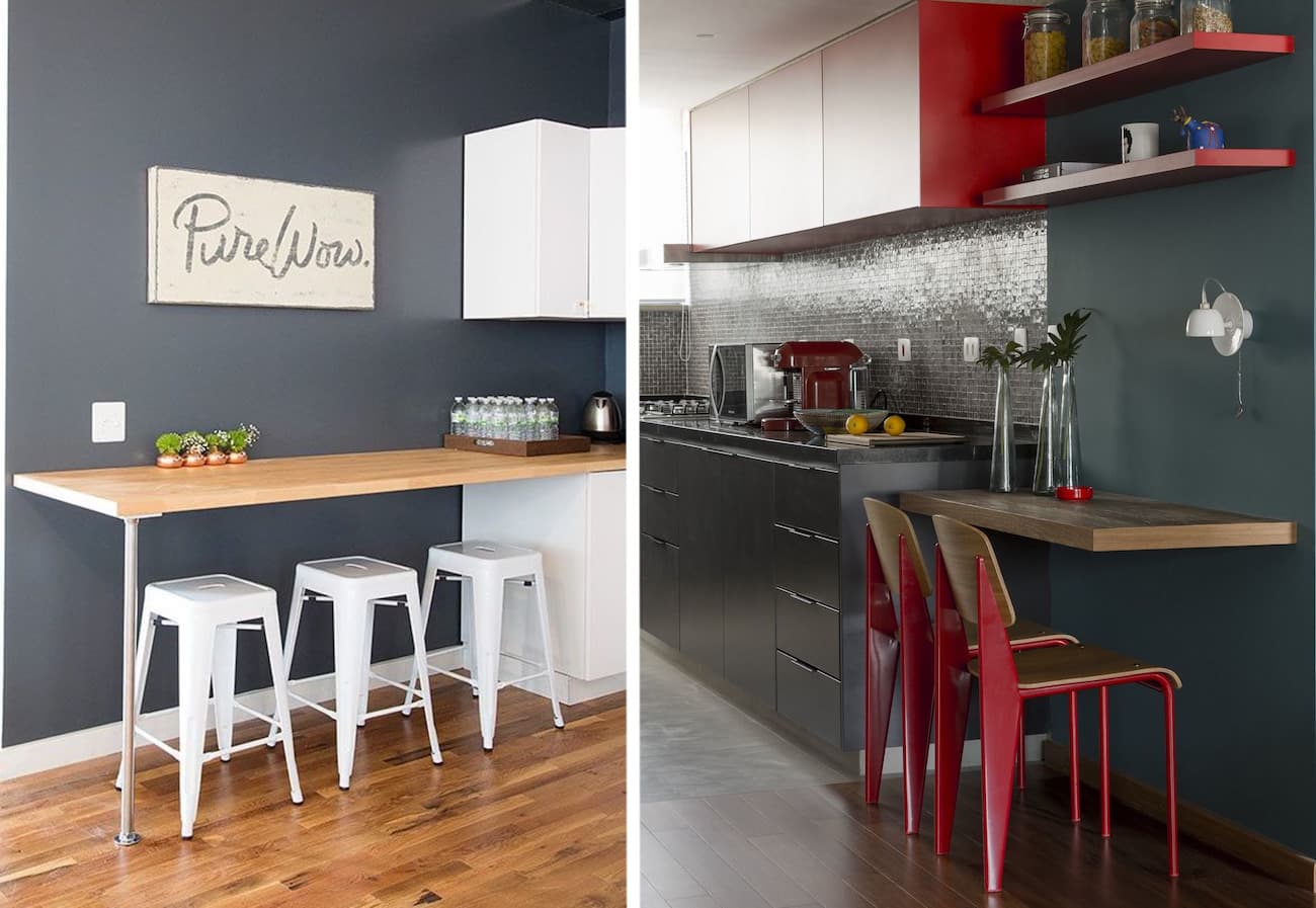 Если тебе нужен отдельный стол со стульями, не пожалей времени на поиск подходящих моделей. Интересный вариант – раскладные или столы, которые подвешиваются на стену. Когда столешницы не нужна, ее можно просто поднять либо опустить.