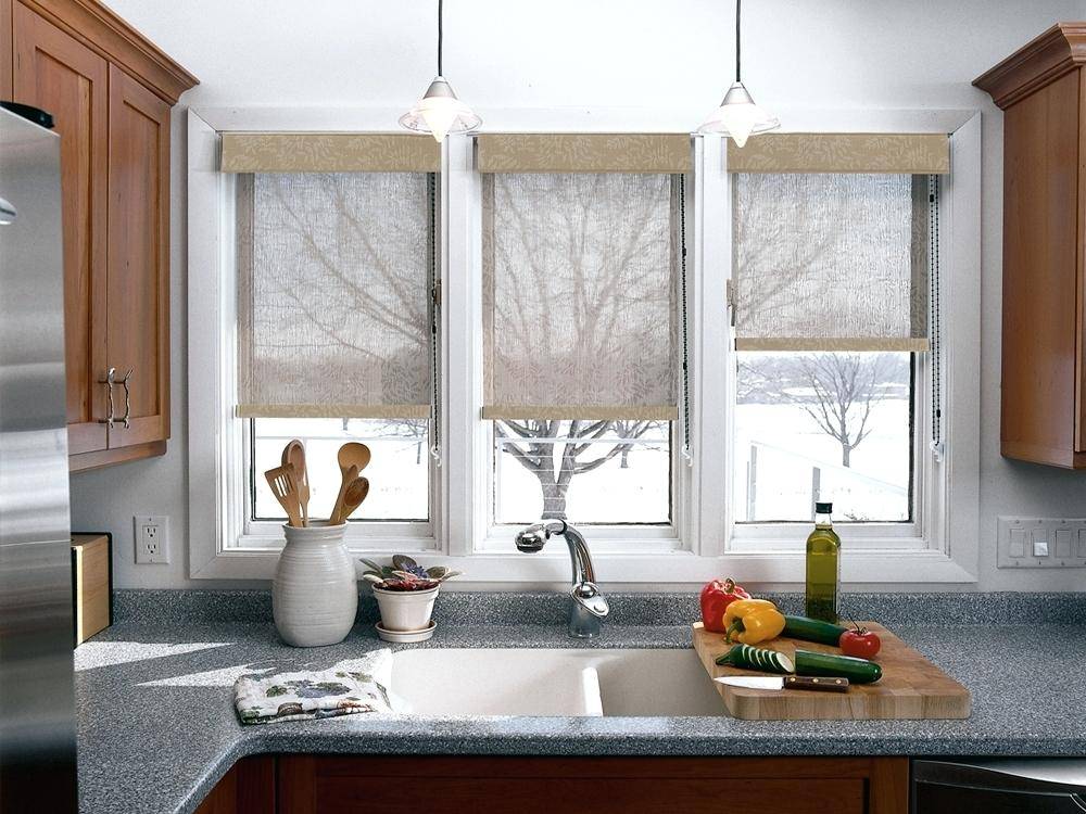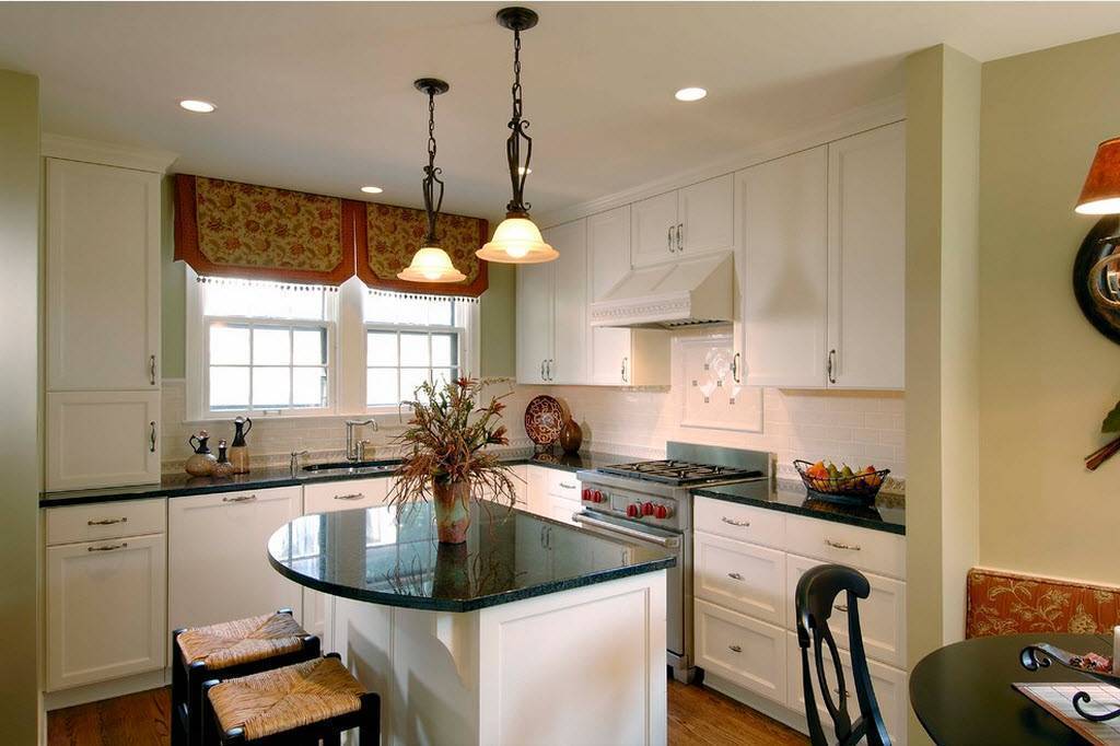 Сложно представить себе квартиру или дом без занавесей и штор. Однако в маленькой кухне использование текстиля должно быть умеренным, поскольку он не только активно впитывает запахи, быстро загрязняется, но и пожароопасен. Оптимальным вариантом будет использование жалюзи, римских или рулонных бамбуковых штор. Если же вы не представляете свою кухню без традиционного текстиля, то для защиты от солнца можно использовать короткую полупрозрачную занавесь или узкую полосу плотного материала, которая будет выполнять функцию солнцезащитного козырька.