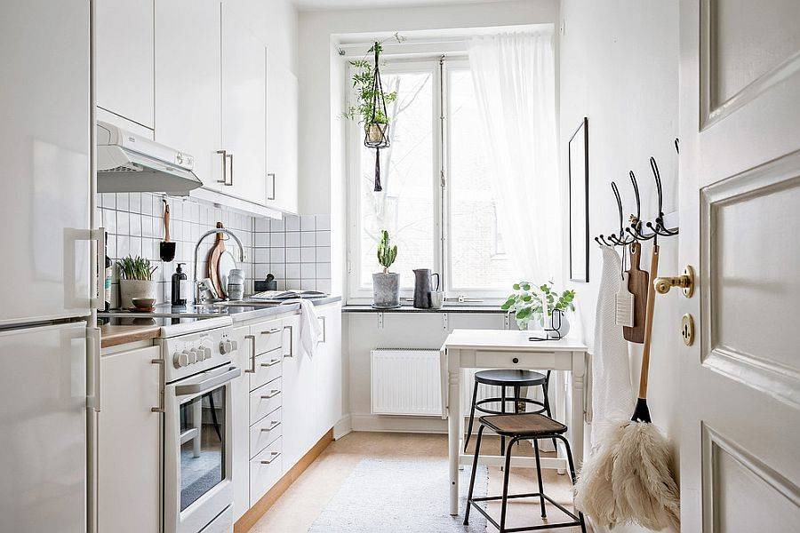Для того, чтобы оборудовать компактную обеденную зону для семейной пары, можно воспользоваться нехитрыми секретами и задействовать пространство угла, расположенного непосредственно у двери или установить узкий кухонный стол напротив рабочей зоны кухни.