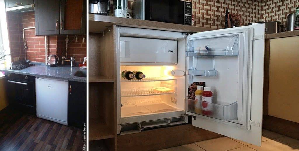 нестандартное расположение холодильника (если не получается вместить высокий стандартный холодильник, то стоит рассмотреть горизонтальное расположение техники – например, под столешницей в нижних шкафах. Минус такого варианта – необходимость регулярно наклоняться за продуктами. Зато вы сэкономите место и визуально освободите пространство);