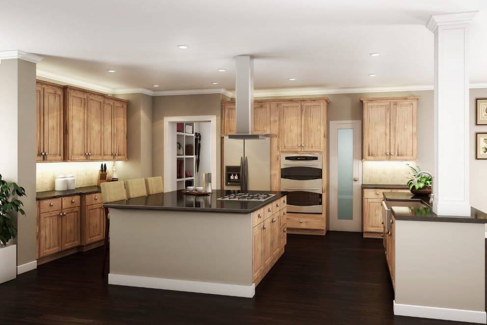 Богатый прованс с островом и полуостровом, который разграничивает пространство, придаст помещению шикарный вид.