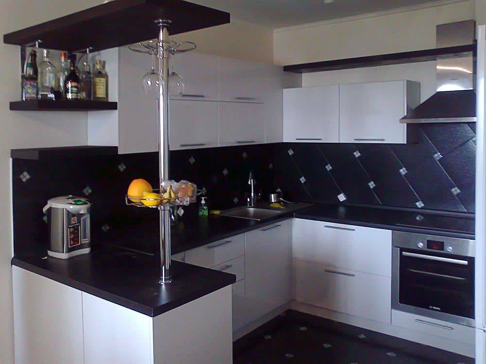 Её лучше установить на широкой столешнице. Смежная стена – зона приготовления пищи. А третья стена берет на себя функцию хранилища, там ставят холодильник, шкафчики или барную стойку.