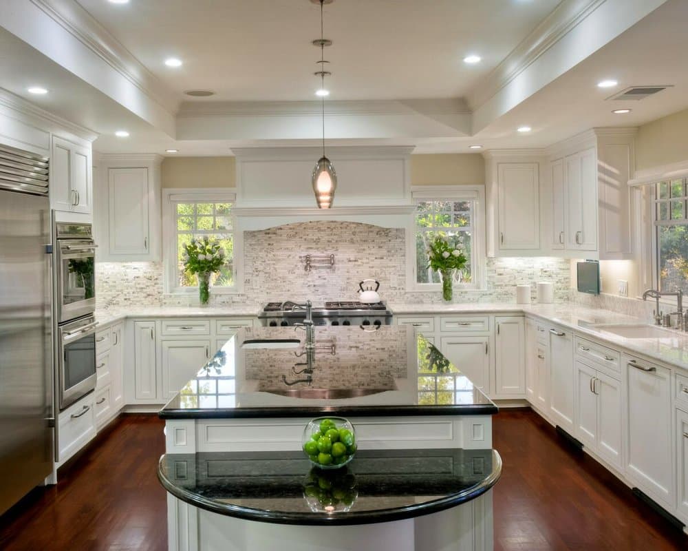 В гарнитур кухни буквой П впишется отдельно стоящий элемент, называемый островом. Ниже – пример интерьера в классическом белом цвете, с большим островным элементом.