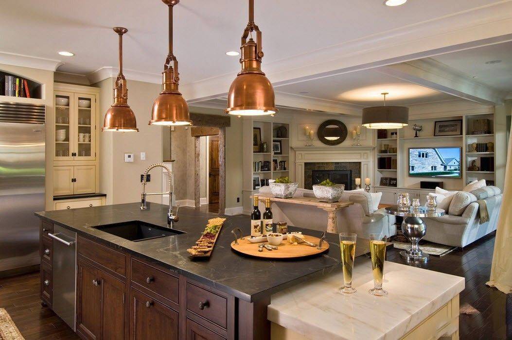 Разное освещение зон. Есть несколько способов зонировать кухню-гостиную при помощи света и светильников. Во-первых, подвесы, настенные бра или торшер на полу могут непосредственно обозначать границу между комнатами. Во-вторых, упорядочить многофункциональное пространство помогут разные светильники — парадная люстра в центре гостиной и более скромный на вид светильник (или точечные светильники) в рабочей зоне. Есть и третий способ, когда и кухня, и гостиная освещаются точечными светильниками по периметру потолка, а парадный светильник висит прямо над столом.