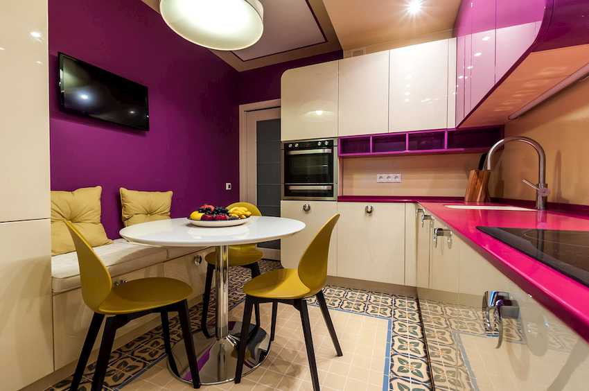Дизайн фиолетовой кухни: нюансы в оформлении стен, пола и потолка