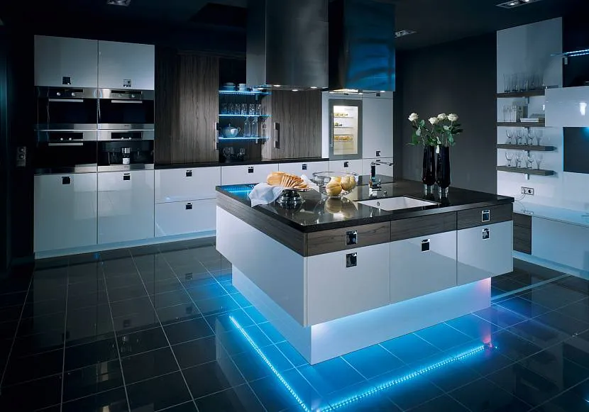 Чтобы сделать кухню более яркой и выразительной, используйте вмонтированную подсветку (как правило, ее можно встроить и установить на основании навесных шкафов и полок) или светодиодную ленту. А в дополнение к самому гарнитуру можно подобрать пластиковые или стеклянные панели с тематическим изображением, соответствующим дизайну кухни.