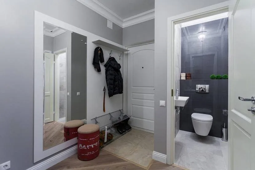 Поскольку в этом помещении практически всегда отсутствует естественное освещение, то следует установить яркие лампочки и большое зеркало. В коридоре могут быть серые стены, но остальные поверхности тогда должны отличаться оттенком или расцветкой. Нужен белый потолок и очень мало контрастных цветовых сочетаний.