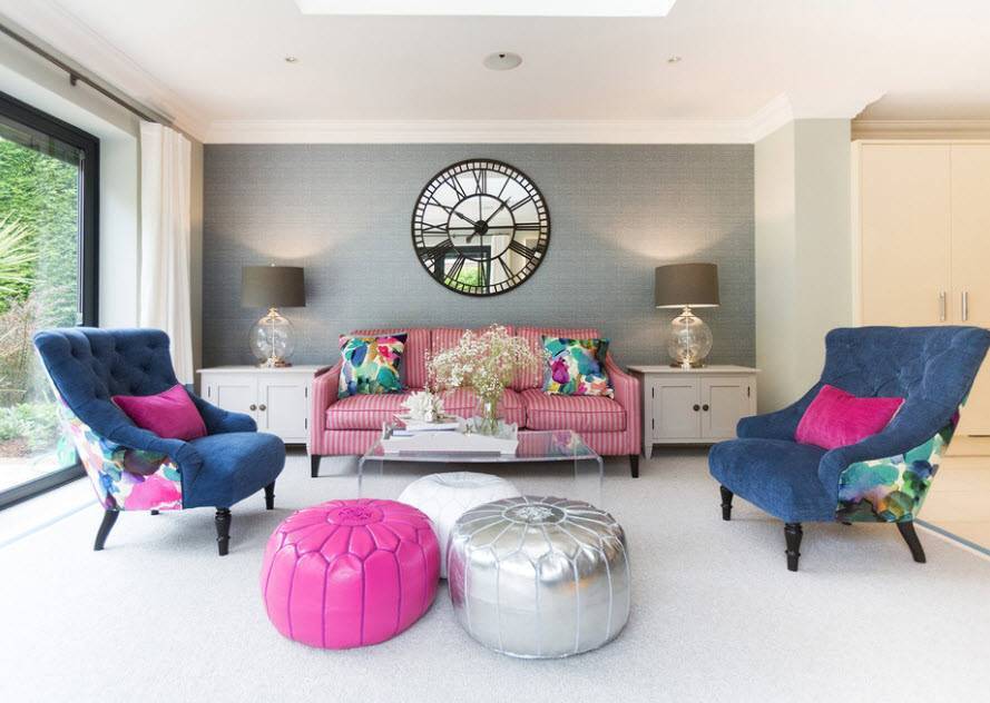 - Пример два. Вы имеете: светло-серый диван и такие же полки, или модульную конструкции. В этом случае можно взять те же серые обои, только более уходящие в синий цвет, достаточно темные. А чтобы интерьер не был мрачным, разбавьте его двумя яркими цветами – желтым и малиновым. Это могут быть диванные подушки, картина стене, журнальный столик, торшер. Это очень современный интерьер, и динамичный, и свежий, но при этом не лишенный благородства, стильный и модный.