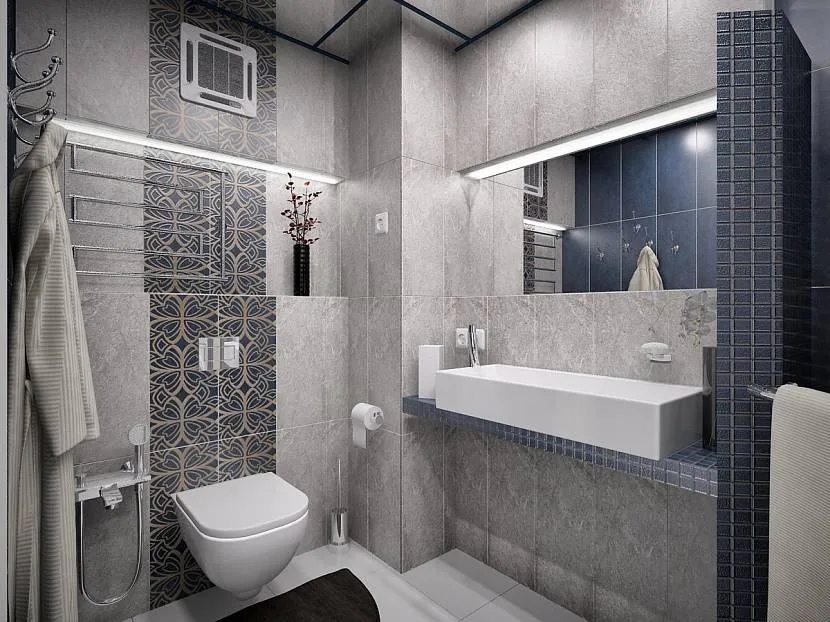 Кафель светло серого цвета добавляет уют, подчеркивает чистоту. Выигрышным вариантом становятся серые стены, яркая плитка. Большие принтовые рисунки в тренде, хорошо разбавляют монохромное спокойствие основного цвета.