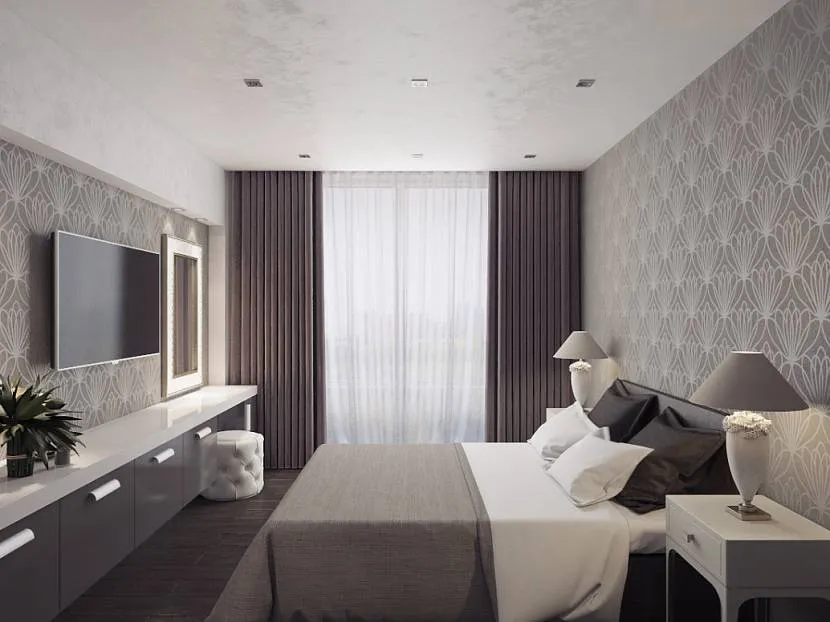 Отделка стен. Выбираются разные отделочные материалы, но часто выбираются серые обои без рисунка. Узоры и рисунки для красоты, а также отделка декоративной штукатуркой выполняется на одной стене спальной комнаты, часто около кровати. В качестве краски для общего фона выбираются матовые образцы, а глянцевые нужны для выделения отдельных деталей. Ещё глянец зрительно расширяет площадь комнаты;