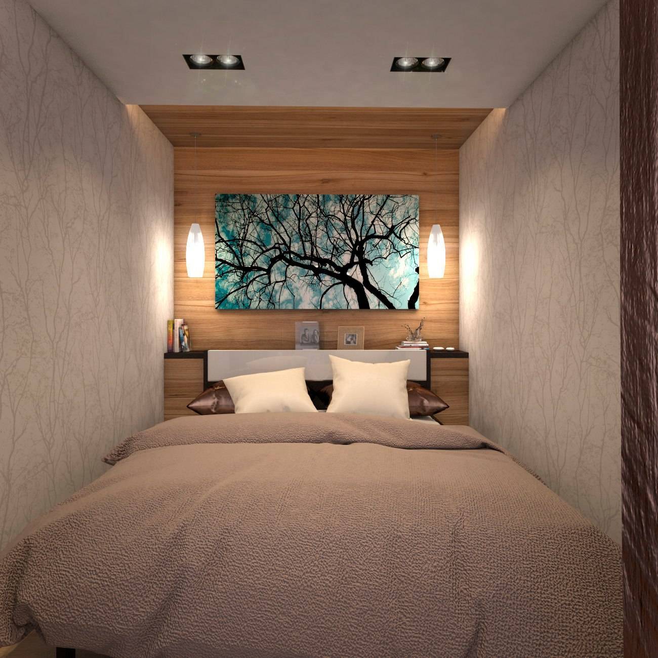 Совет! Чтобы сэкономить пространство, кровать можно поставить вплотную к стене. Пожертвовав подходом и прикроватной тумбочкой, можно выиграть место для установки шкафа, кресла для чтения или туалетного столика.