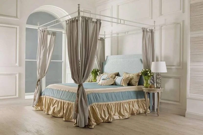 Во времена демонстративной роскоши – барокко – основные функции балдахина утратили актуальность – активное развитие получил декор. Шатровые конструкции кроватей пышно драпировались дорогими, изысканными тканями: бархатом, шелком, штофом. Но грянувший век классицизма вернул балдахину почти открытую изящную конструкцию: стойки стали «стройнее», громоздкие занавеси заметно полегчали. Все, что осталось от драпировок, – это символический «палантин» у одной из сторон кровати.