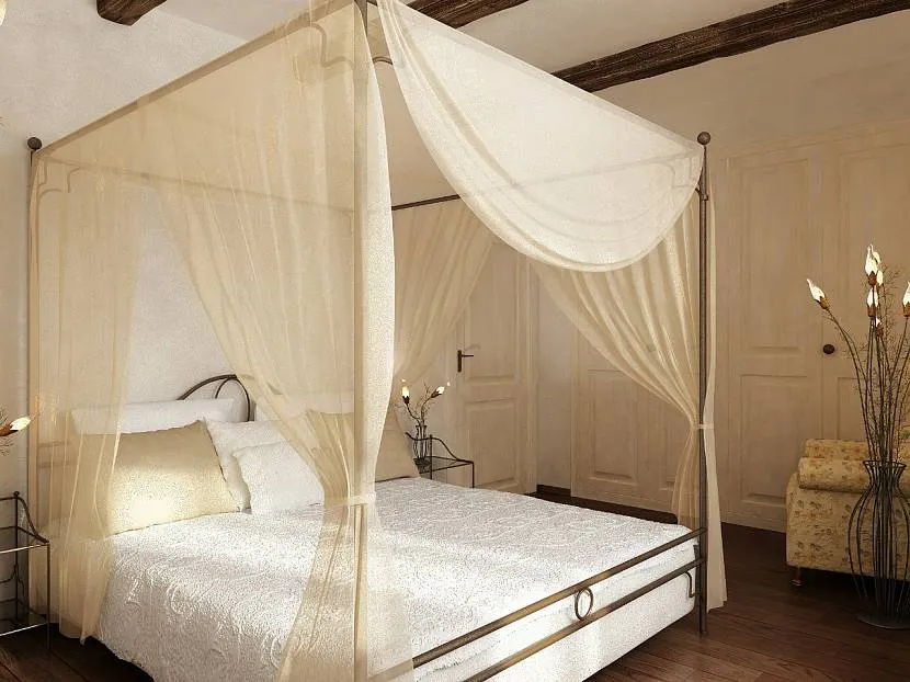 В случае применения независимых опор они размещаются по углам кровати, а сверху на них раскладывается ткань, свисающая вниз. Такая конструкция может применяться в помещениях с высоким потолком, так как опоры не должны доставать до него.