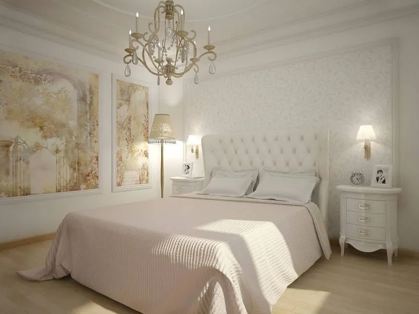 Винтажные обои и художественная люстра часто встречаются в интерьерах классической спальни