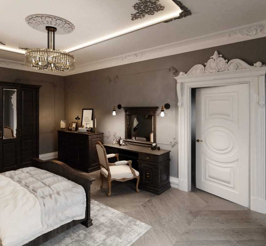 Двери в спальню выполняются в едином стиле с комнатой. При наличии лепки или позолоты на стенах, её контуры должны повторяться и на наличниках или поверхности межкомнатной двери.