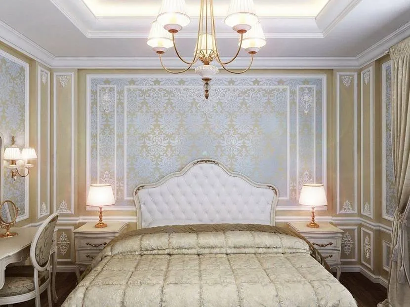 Часто для декорирования применяют обои с рисунком, который обильно насыщен платиной и позолотой. Использование подобных обоев придает спальне импозантный и шикарный вид. Полотно обоев, обильно насыщенное мелкими деталями орнамента, необходимо разбавить. Для этого на плоскости стены выделяют участок стены, однотонно окрашенный, и окантовывают его лепниной.