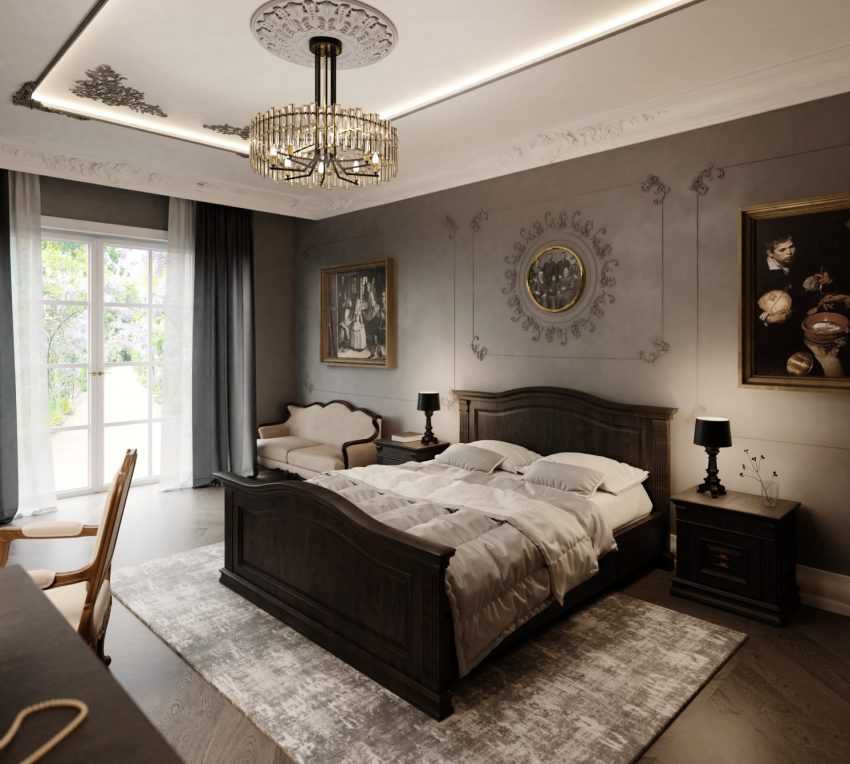 Классическая спальня оформляется в сдержанной цветовой гамме