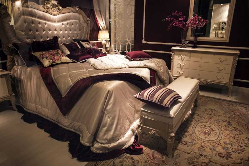Другими обязательными предметами интерьера являются платяной шкаф, комод, прикроватные тумбочки, туалетный столик. В комнате стулья должны быть обязательно мягкими, а лучше заменить их на уютные кресла или пуфы.