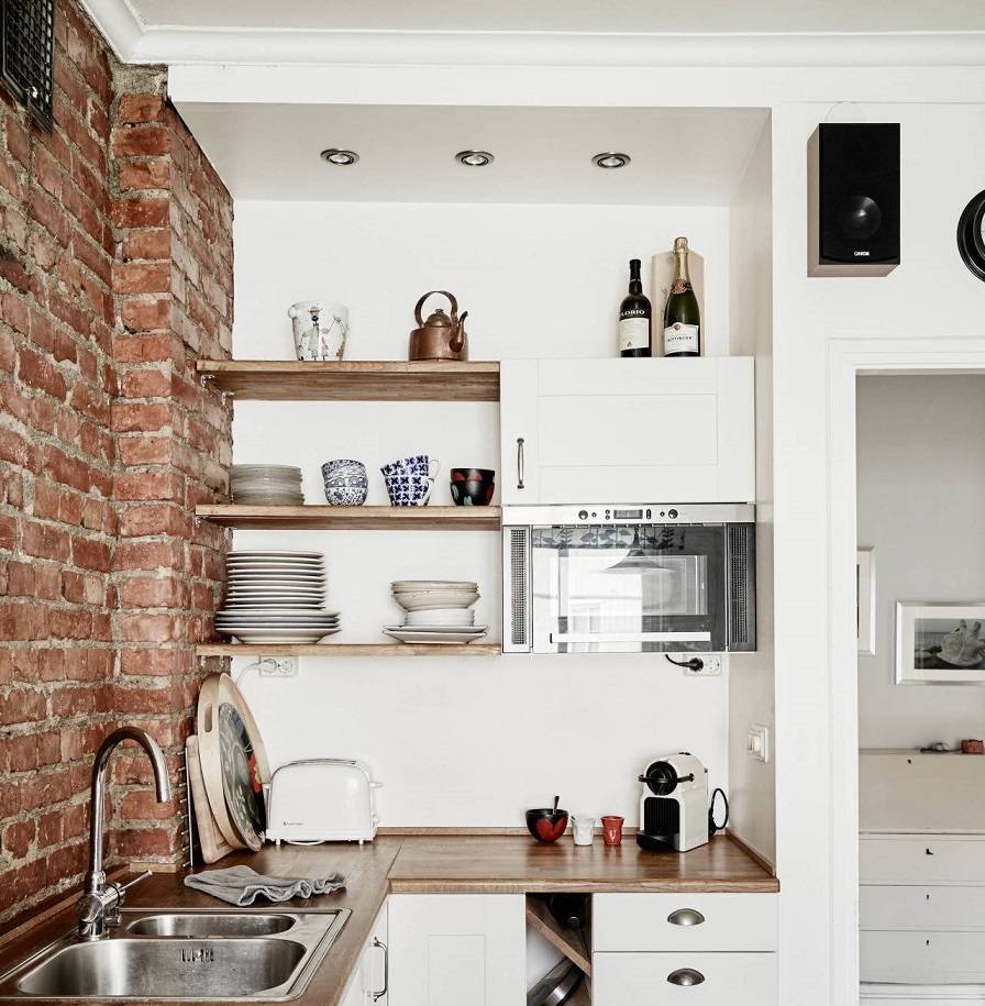 Создать иллюзию простора в маленькой кухне можно и с помощью стилизации под лофт. Чтобы комната казалась легкой и воздушной, оборудуй открытые полки, а также используй белый цвет в оформлении потолка, стен и мебели.