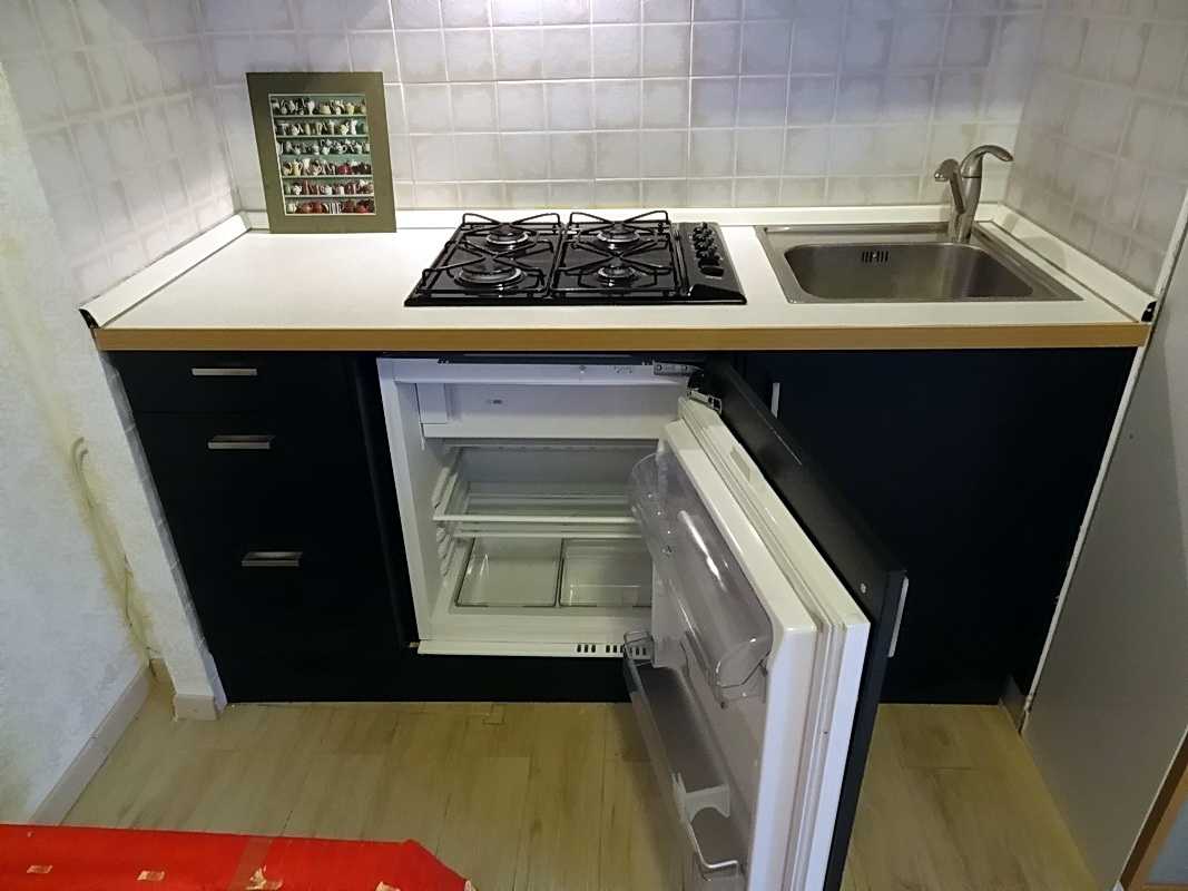 Традиционно размещают холодильник рядом с входом. Но тогда нужен демонтаж входной кухонной двери. В качестве альтернативы поставьте дверку, которая раздвигается в случае необходимости.