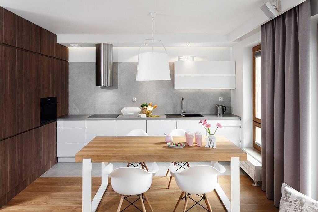 - Кухня-гостиная. Минимальное пространство для размещения бытовой техники можно обыграть за счет переноса обеденной зоны в гостиную.